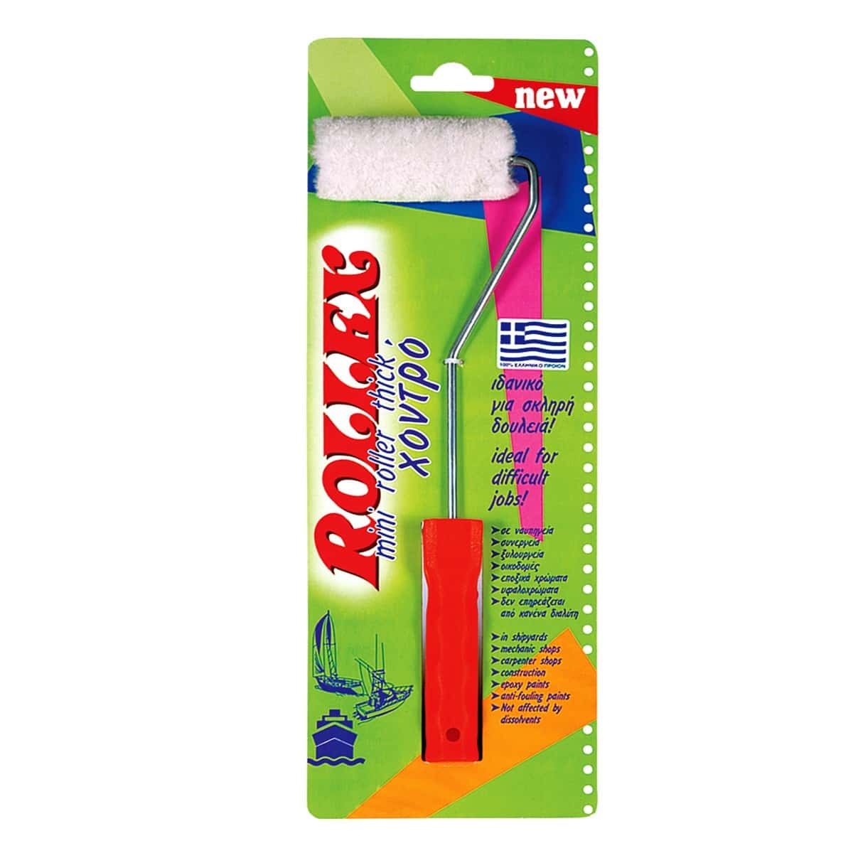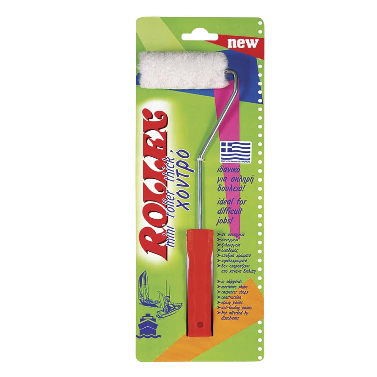 Μίνι ρολό βαφής καλοριφέρ “χοντρό” της Rollex. Κατασκευασμένο από φυσική γούνα merinos με ύψος πέλματος γούνας 1cm. Πρωτοποριακό mini γούνινο ρολό, για κάθε τύπο χρώματος. Δεν επηρεάζεται από κανέναν διαλύτη για αυτό και χρησιμοποιείται σε ναυπηγεία, συνεργεία, ξυλουργεία, οικοδομές κ.λπ. Είναι κατάλληλο για εποξικά χρώματα, υφαλοχρώματα κ.λπ.  Διατίθεται σε διάσταση 10cm. Διαθέτει ειδική λαβή με υποδοχή για να κουμπώνει σε κοντάρια που επιμηκύνονται.