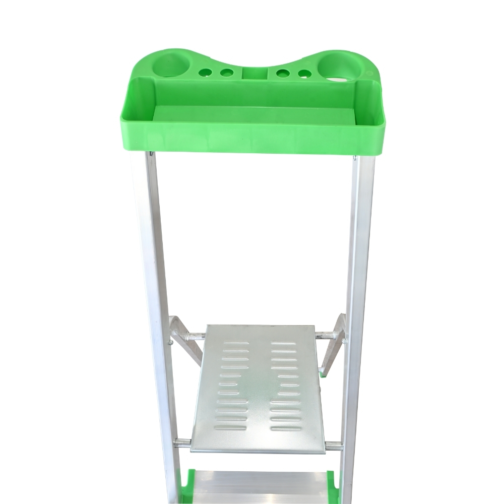 Σκάλα αλουμινίου με εργαλειοθήκη κατάλληλη για επαγγελματική χρήση. Κατασκευάζεται εξ ολοκλήρου από αλουμίνιο (σκελετός και σκαλοπάτια) για να είναι ελαφριά σε βάρος, εύχρηστη και ανθεκτική στη χρήση, στις καιρικές συνθήκες και στη διάβρωση. Έχει φαρδιά σκαλοπάτια (13cm) με αντιολισθητική επιφάνεια για να μη γλιστράνε. Διαθέτει ιμάντες ασφαλείας και πρόσθετο μεταλλικό δικτύωμα (χιαστί) που μεγιστοποιεί την σταθερότητα της σκάλας. Διαθέτει ψηλό κάγκελο στην κορυφή που βοηθά στην ισορροπία και εργαλειοθήκη για να διευκολύνει τον τεχνίτη στην εργασία του. Διαθέτει πλαστικές τάπες και στα τέσσερα πόδια για να είναι σταθερή και ασφαλής και πλαστικά καλύμματα στις άκρες από τα σκαλοπάτια για την αποφυγή ατυχημάτων. Είναι πιστοποιημένη με ΕΝ131 για μέγιστο φορτίο 150 κιλών. Ελληνικής κατασκευής με εγγύηση 2 χρόνων από τον κατασκευαστή.