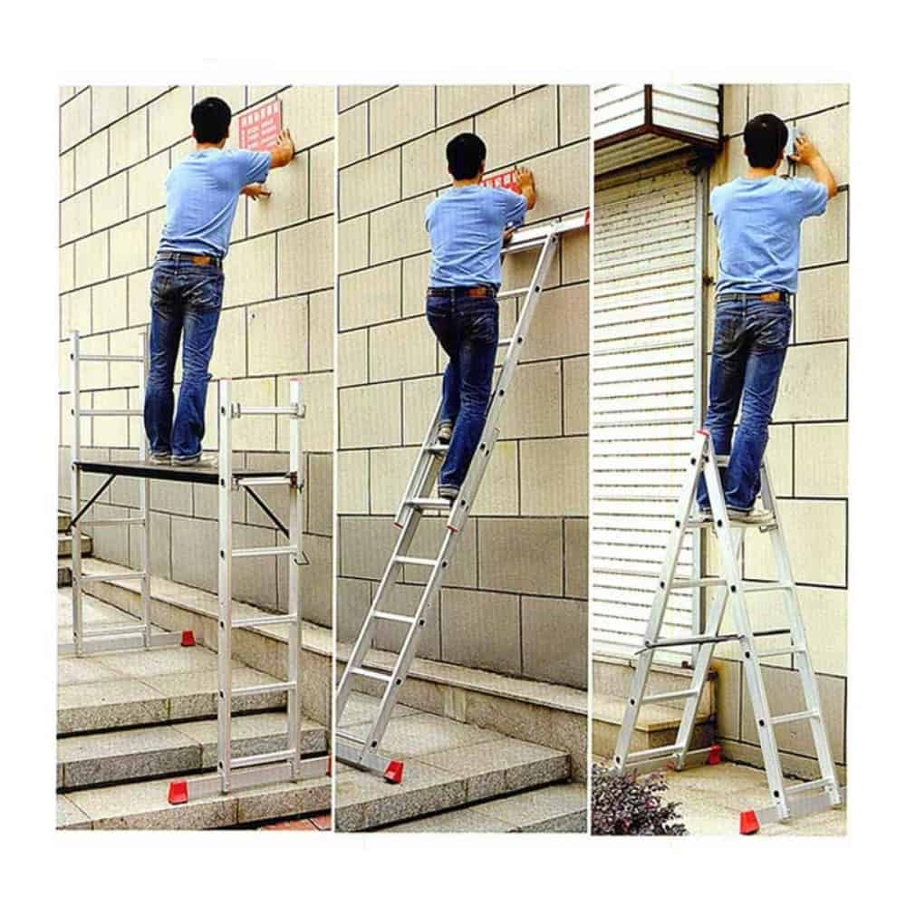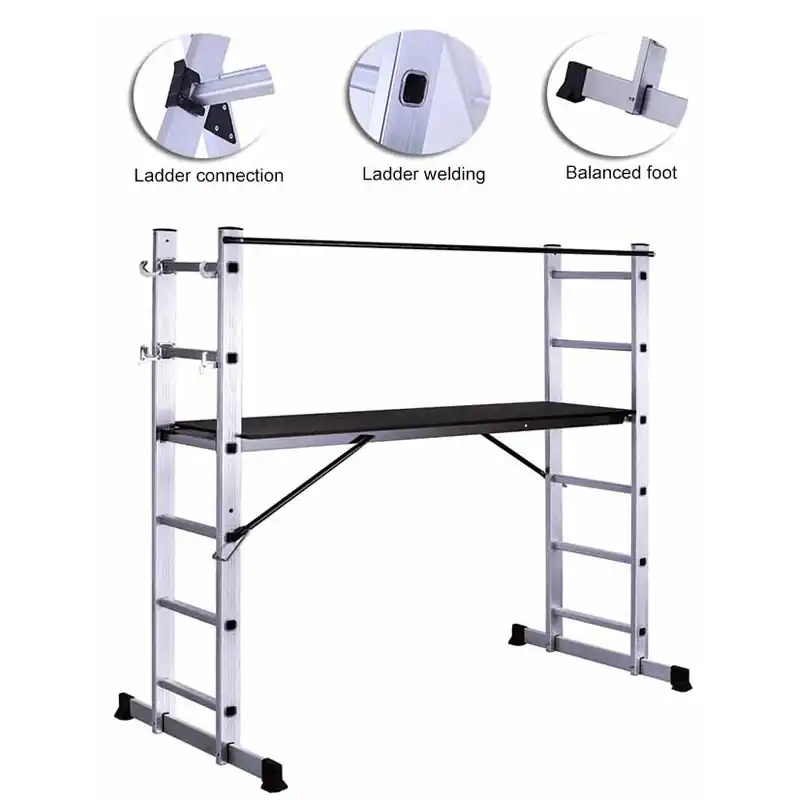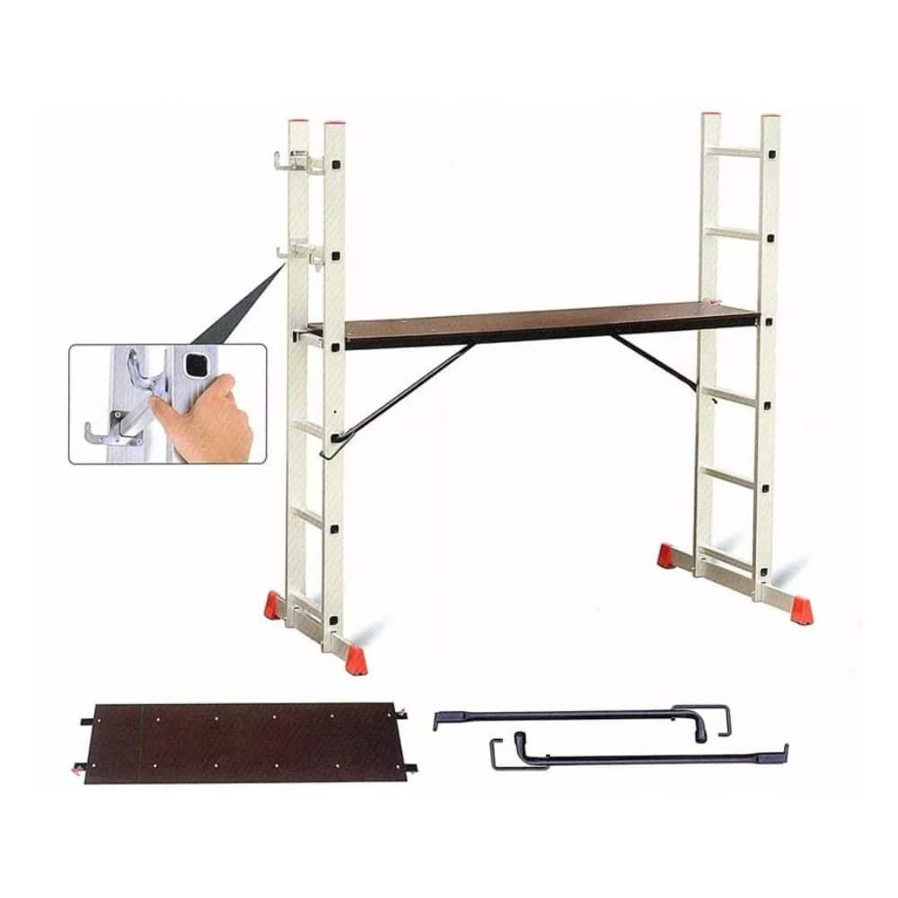 Σκαλωσιά σκάλας αλουμινίου, βαρέως τύπου για επαγγελματική χρήση σε εσωτερικούς και εξωτερικούς χώρους. Κατασκευασμένη από αλουμίνιο ενισχυμένου προφίλ. Πιστοποίηση ΕΝ131 για μέγιστο φορτίο 150 κιλά. Συμπεριλαμβάνονται η πλατφόρμα εργασίας διαστάσεων 1,48×0,42m, οι 2 μπάρες στήριξης των βάσεων πλάτους 66cm, οι 2 ρόδες κύλησης, οι 2 βραχίονες στήριξης της πλατφόρμας και η μπάρα πρόσδεσης ασφαλειών . Κάθε σκέλος της σκάλας της σκαλωσιάς έχει 7 σκαλοπάτια (2×7) με αντιολισθητική επιφάνεια για να μη γλιστράνε και απέχουν μεταξύ τους 30cm. To μέγιστο ύψος είναι 1,80m. Καθαρό βάρος 15,9kg.