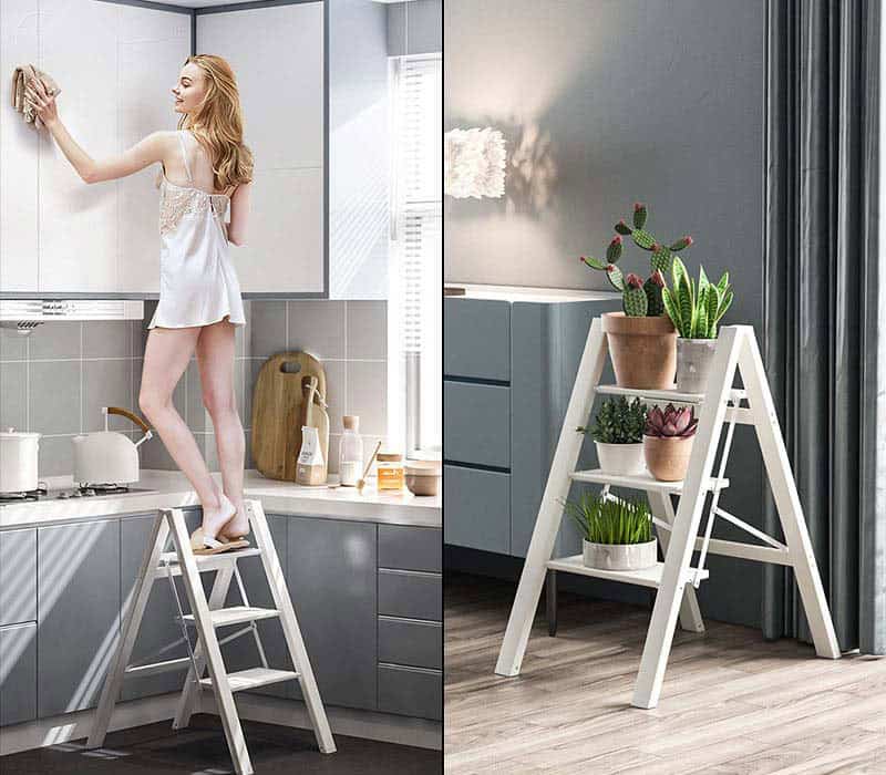 Σκαλοσκαμπό αλουμινίου πολλαπλών χρήσεων ιδανικό για χρήση σε σπίτια, καταστήματα, αποθήκες και γενικά σε χώρους όπου απαιτείται να φτάσετε ψηλότερα. Κατασκευασμένο από ενισχυμένο κράμα αλουμινίου υψηλής ποιότητας με ηλεκτροστατική βαφή σε λευκό χρώμα. Με πιστοποίηση ΕΝ 14183 με μέγιστο βάρος φορτίου 150 κιλά. Είναι πτυσσόμενο για να καταλαμβάνει λίγο χώρο όταν δεν το χρησιμοποιείτε. Με αντιολισθητική, επιφάνεια σε κάθε σκαλοπάτι και λαστιχένιες τάπες και στα τέσσερα πόδια για να είναι σταθερό και ασφαλές σε κάθε σας βήμα. Ιδανικό και ως πρόταση διακόσμησης αφού μπορεί να χρησιμοποιηθεί και ως ραφιέρα. Όλα τα σκαλοπάτια έχουν διάσταση 17,5×31 εκατοστά για να πατάτε πάνω τους σταθερά.