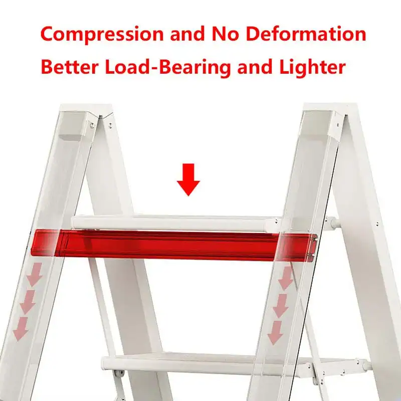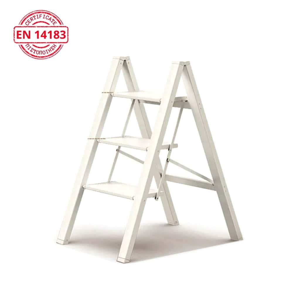 Κατάλληλο για οικιακή χρήση. Κατασκευασμένο από ενισχυμένο κράμα αλουμινίου υψηλής ποιότητας με ηλεκτροστατική βαφή σε λευκό χρώμα. Πιστοποίηση ΕΝ 14183 για μέγιστο βάρος φορτίου 150 κιλά. Με αντιολισθητική, επιφάνεια σε κάθε σκαλοπάτι και λαστιχένιες τάπες και στα τέσσερα πόδια για να είναι σταθερό και ασφαλές. Διάσταση σκαλοπατιού 17,5x31cm.