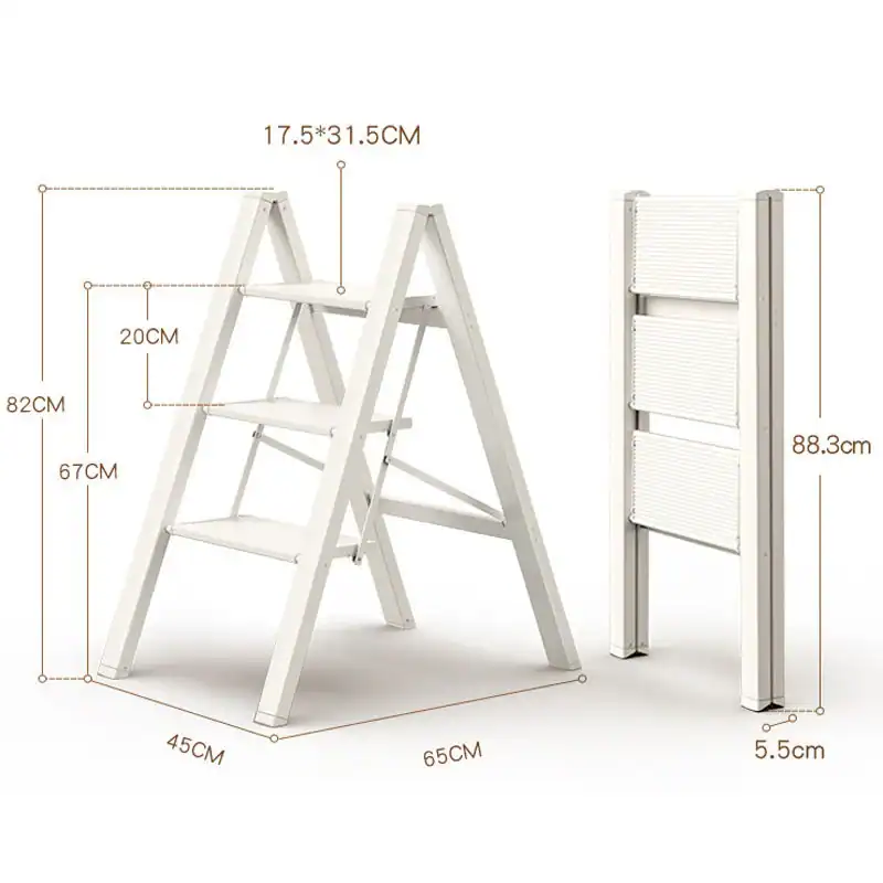- Το μοντέλο των 3 σκαλοπατιών έχει μέγιστο ύψος 69cm στο τελευταίο σκαλοπάτι. Διαστάσεις στην ανοιχτή θέση: 45x65x82cm. Βάρος: 3,3kg. Διαστάσεις συσκευασίας: 47×6,5×85,5cm