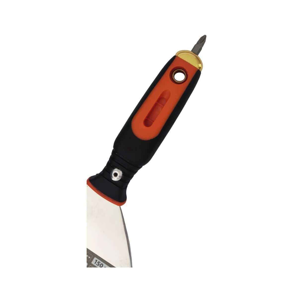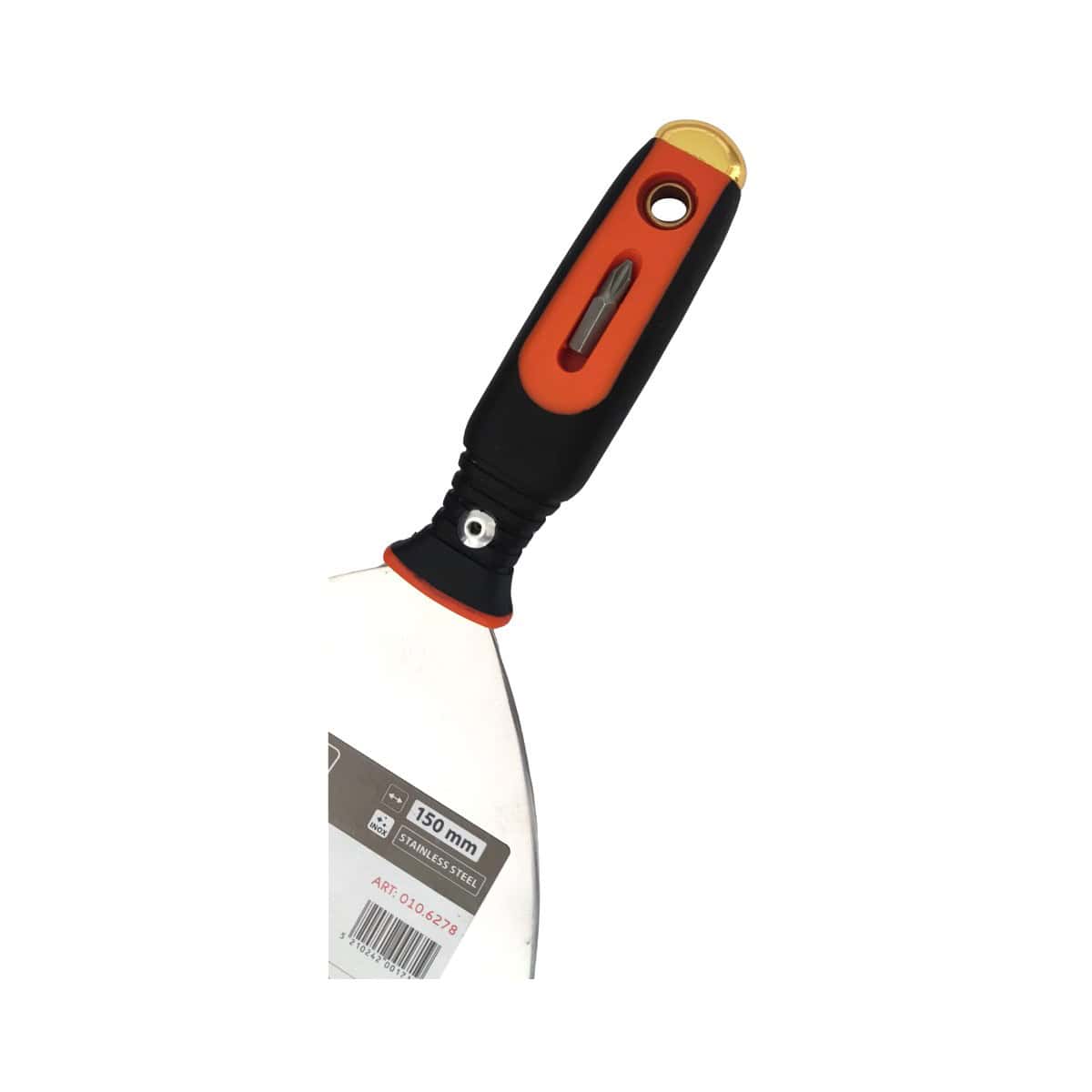 Βιδοσπάτουλα για γυψοσανίδες με ανοξείδωτη λάμα 15cm και υποδοχή για μύτες κατσαβιδιού στο πίσω μέρος της λαβής. Με εργονομική λαβή για άνετη και πολύωρη χρήση. Συμπεριλαμβάνεται μύτη σταυροκατσάβιδου.
